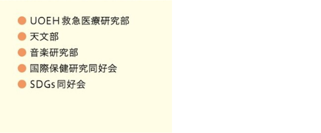 3号館2階の各サークル室や3階ホール、武道館1階の軽音楽練習場などを中心に現在、19団体が活発な活動を行っています。また、本格的なコンサートが開催できる「ラマツィーニホール(1,000人収容可能)」では毎年、チャリティ演奏会などが開催されます。学部・学科の枠をこえ、同じ目標に向かって励む仲間たちとの切磋琢磨がここにあります。